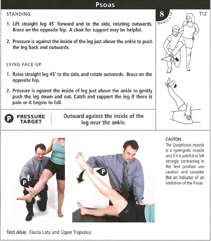 - 전상장골극(ASIS) 뒤쪽의 장골(Ilium)의 내측 경계에 대한 촉진(Palpation)으로 상위 장골근(Iliacus)의 단단한 띠(Taut band)와 통증 유발점(Trigger point)에 대해 검사