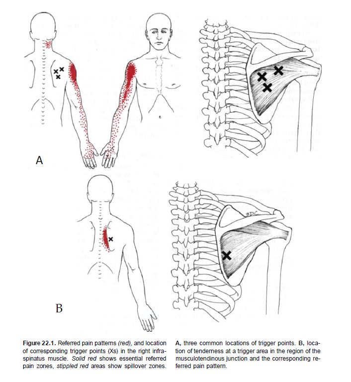 극하근(Infraspinatus)의 연관통(Referred pain)은 어깨관절 깊은곳, 상완 전외측, 전완 외측, 손의 바깥쪽으로 발생합니다. 종종 견갑골 내측(Scpular medial border)에서 통증이 발생하는 경우도 있습니다.