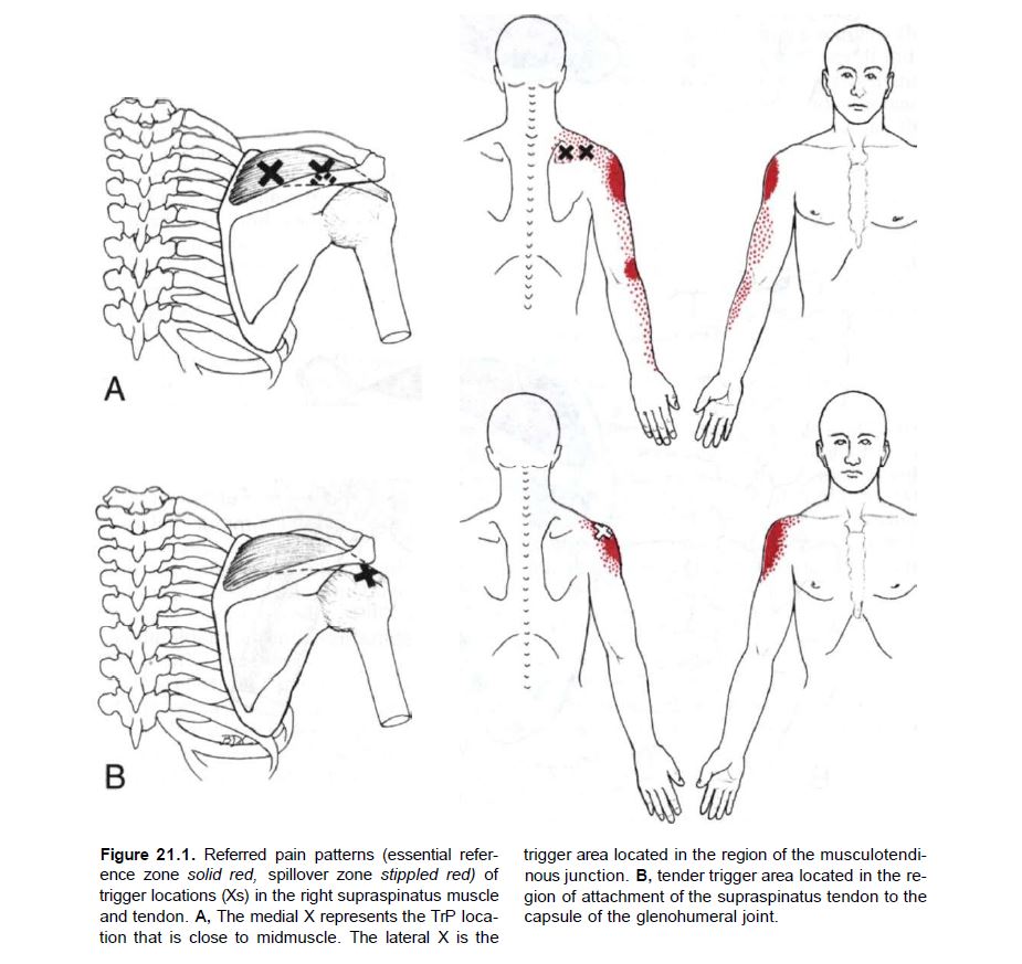 극상근의 통증 유발점(Trigger point)이 있을경우 어깨 깊숙한 부위 및 삼각근 주변으로 통증이 생긴다. 그리고 팔을 들어 올릴(Abduction) 때 주로 통증이 발생한다. 극하근(Infraspinatus)의 통증 유발점 패턴과 극상근 통증 유발점 패턴은 비슷하다.