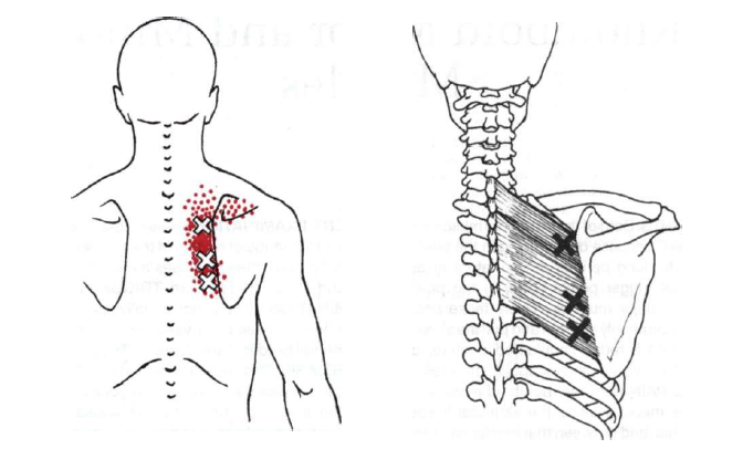 능형근(Rhomboids) 통증유발점(Trigger point)에서 발생하는 연관통(Referred pain)은 견갑골 내측 부위로 발생한다.