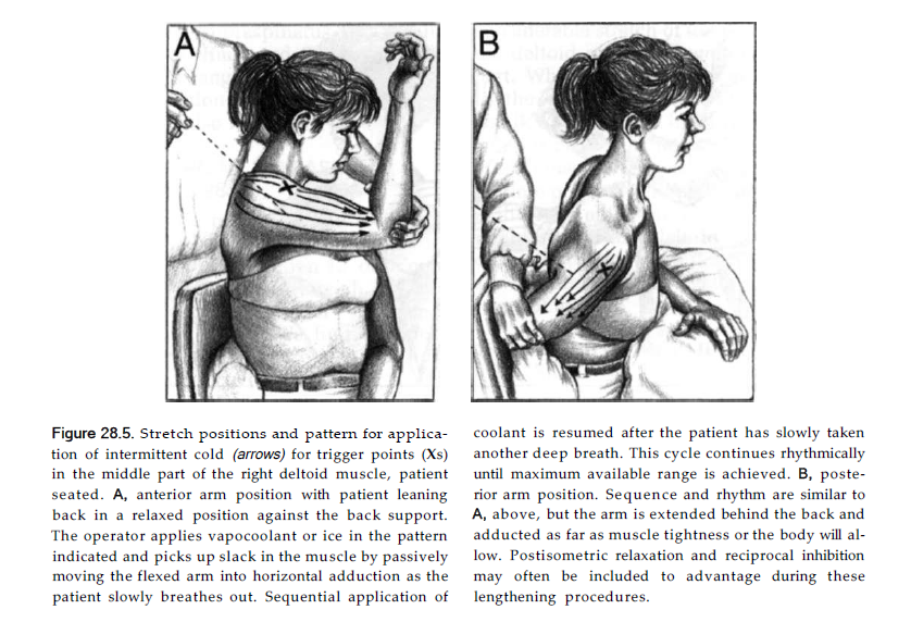 전삼각근 스트레칭은 앉은 자세로 시행한다. 편안히 의자에 뒤로 기대앉은 상태로 숨을 내쉬면서 팔을 최대한 수평 외전(Horizontal abduction) 시킨다(그림 A). 후삼각근 스트레칭은 반대쪽 어깨를 잡듯이 가슴을 가로질러 팔을 내전(Adduction)시켜준다(그림 B).
